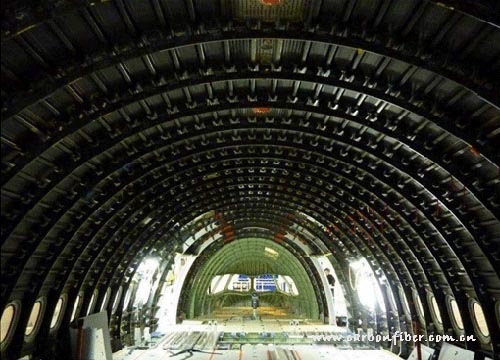 首個A350XWB前機身內(nèi)部構(gòu)造。前機身結(jié)構(gòu)采用碳纖維復(fù)合材料,正在法國圣納澤爾工廠進行組裝。