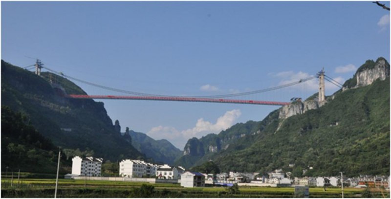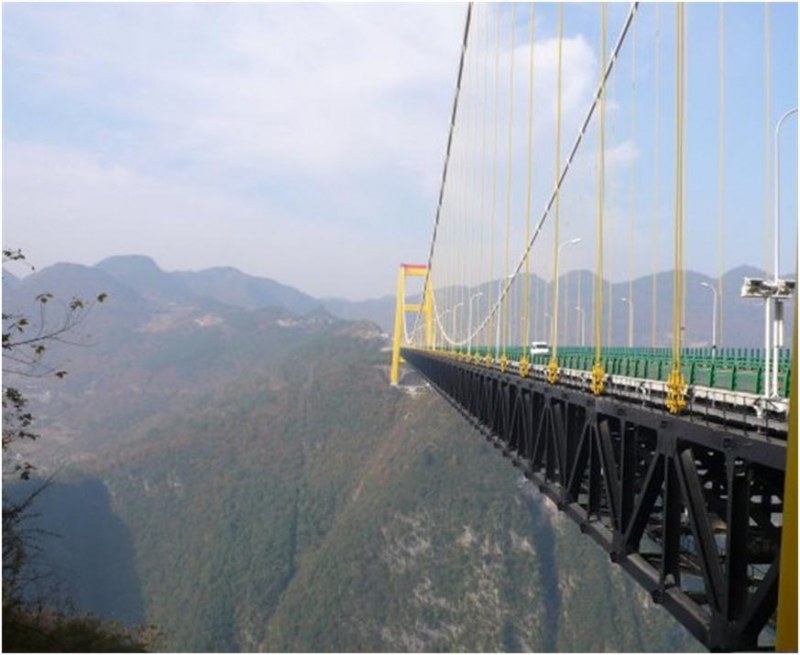 矮寨特大懸索橋是長沙至重慶公路通道吉茶高速公路的控制性工程,距吉首市約20公里,在矮寨鎮(zhèn)上空355米處跨越德夯大峽谷,主跨跨徑1176米,是目前世界上跨峽谷跨徑最大的鋼桁梁懸索橋。大橋地處峽谷,峽谷總體呈V字型,兩側(cè)懸崖距離從900m到1300m變化,平均坡度達40度,最陡處懸崖直立,施工場地十分狹小,而且橋面與谷底垂直高差達330余米,施工難度大。也由此創(chuàng)下“四項世界第一”。