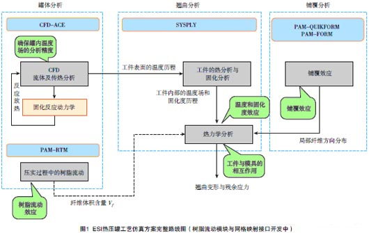 復(fù)合材料的熱壓罐成型工藝過程是一個(gè)涉及對(duì)流換熱、結(jié)構(gòu)熱變形和固化相變反應(yīng)的復(fù)雜物理化學(xué)過程。完整的熱壓罐工藝分析方案應(yīng)考慮的因素應(yīng)包括: