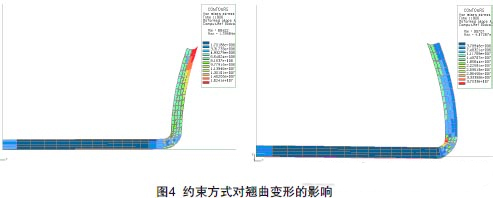 在固化變形分析中,熱膨脹與固化收縮決定了預(yù)浸料應(yīng)變能的水平,而預(yù)浸料的約束方式則直接決定了殘余應(yīng)力在結(jié)構(gòu)上的分布狀態(tài)。殘余應(yīng)力在厚度方向上分布的 不平衡導(dǎo)致了結(jié)構(gòu)的翹曲變形。圖4為采用相同預(yù)浸料,經(jīng)歷相同的溫度歷程,在不同約束方式下的兩個(gè)L型件的變形計(jì)算結(jié)果。左圖L 型件外側(cè)施加全約束,固化結(jié)束后釋放約束;右圖L型件內(nèi)側(cè)施加全約束,固化結(jié)束后釋放約束。可見,采用不同的約束方式將顯著影響最終的變形結(jié)果。