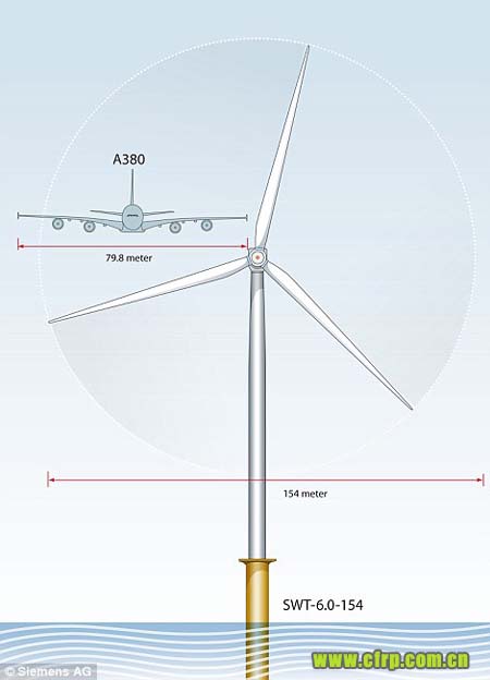 報道稱,這座目前世界上最大的風(fēng)車是由德國西門子公司開發(fā)的大型風(fēng)力發(fā)電機(jī),擁有三片長度達(dá)到75米的扇葉,僅僅比空客公司的巨無霸客機(jī)A380的翼展(79.8米)略短。報道稱,這座大風(fēng)車將于2014年矗立在臨近英國埃塞克斯郡海岸的水中。