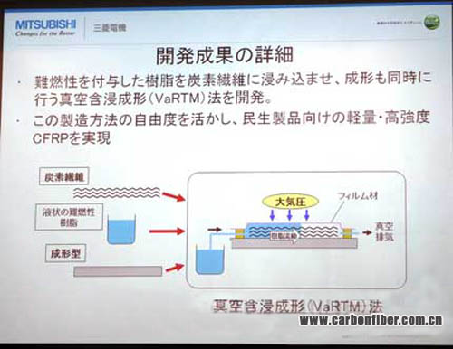 三菱電機采用的是稱為真空輔助樹脂轉(zhuǎn)移成型(VaRTM)法的工藝:將置于模具上的碳纖維用薄膜材料密封起來,邊向模具和薄膜材料之間注入樹脂邊減壓,使其在大氣壓下成型。樹脂采用了通用的阻燃性乙烯酯。雖然VaRTM法早已是廣為人知,但樹脂的流動及纖維配向控制,以及在碳纖維中夾入隔熱材料等其他材料等的“生產(chǎn)技術的提高,才使得其能適用于消費類產(chǎn)品”。該公司已將CFRP應用于人造衛(wèi)星,但人造衛(wèi)星用CFRP需要用熱壓罐對預浸料進行加熱加壓等,存在預浸料及熱壓罐設備導致成本上升的難題。