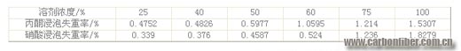 采用丙酮、硝酸作為溶劑進(jìn)行浸泡,不同濃度條件下,碳纖維浸泡后的失重率見表2。