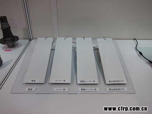 圖:碳纖維強化PP的成形樣品 最右邊寫著“射出成形用CFRP”的是在碳纖維強化PP成形品上涂了白漆的樣品。從左邊起依次是鋼板、保險杠用PP成形品、在擋泥板用樹脂成形品上涂了白漆的樣品。