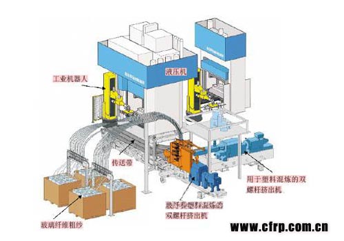 在這種工藝方案中,第一臺(tái)雙螺桿擠出機(jī)將塑料粒料和添加劑熔融混合,并擠出到第二臺(tái)雙螺桿擠出機(jī)中。第二臺(tái)擠出機(jī)將玻纖切斷,并與塑料熔體混合均勻,擠成約200~300mm寬的條形料。條形料通過帶有加熱功能的傳送帶向前輸送,并由工業(yè)機(jī)器人抓取后送至模具中進(jìn)行模壓成型。