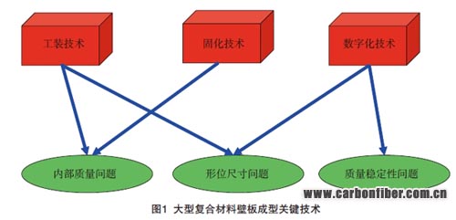 整體成型的大型復(fù)合材料壁板制件,針對(duì)其結(jié)構(gòu)特點(diǎn)以及存在的主要問(wèn)題,其成型的關(guān)鍵技術(shù)主要有3個(gè)方面:工裝技術(shù)、固化成型技術(shù)、數(shù)字化技術(shù),如圖1所示。