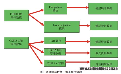 通過(guò)構(gòu)建復(fù)合材料數(shù)字化制造技術(shù)的軟件平臺(tái),采用專用設(shè)計(jì)、工藝軟件建立復(fù)合材料零件三維數(shù)模(工程數(shù)據(jù)),進(jìn)而建立制造數(shù)據(jù)集、程序,實(shí)現(xiàn)與自動(dòng)下料機(jī)、投影定位、自動(dòng)鋪帶機(jī)等數(shù)字化設(shè)備的接口,為復(fù)合材料數(shù)字化制造技術(shù)應(yīng)用打下基礎(chǔ),如圖5所示。