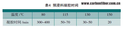 加壓點(diǎn)包括加壓溫度、加壓時(shí)機(jī)。加壓點(diǎn)的選擇, 首先是加壓溫度,加壓溫度過(guò)低則樹(shù)脂流動(dòng)性不好,纖維不易均勻浸潤(rùn)易造成缺陷;加壓溫度過(guò)高,樹(shù)脂聚合速率過(guò)快不易掌握加壓時(shí)機(jī)。其次在確定加壓溫度的前提下把握好加壓時(shí)機(jī),加壓時(shí)機(jī)過(guò)早則樹(shù)脂粘度低,排出樹(shù)脂過(guò)多造成零件貧膠、孔隙率高;加壓時(shí)機(jī)過(guò)晚則樹(shù)脂聚合程度高,流動(dòng)性差制件易夾雜氣泡產(chǎn)生疏松、分層等缺陷。加壓點(diǎn)的最佳選擇為樹(shù)脂由粘流態(tài)向高彈態(tài)轉(zhuǎn)變過(guò)程中的過(guò)渡區(qū)間。這和升溫速率、加壓溫度、加壓時(shí)機(jī)都密切相關(guān),不同的溫度—時(shí)間曲線有著不同的加壓點(diǎn)。目前經(jīng)常采用差熱分析儀和流變儀來(lái)了解樹(shù)脂的固化反應(yīng)過(guò)程和粘度變化過(guò)程,實(shí)際生產(chǎn)中也有用滑板法或拉絲法測(cè)定凝膠時(shí)間來(lái)了解樹(shù)脂在溫度—時(shí)間曲線各個(gè)點(diǎn)的粘度情況,如表4、表5所示。