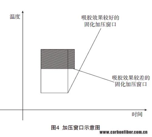 經(jīng)過(guò)試驗(yàn)和工藝驗(yàn)證,應(yīng)該轉(zhuǎn)變我們的工藝觀點(diǎn),應(yīng)注重預(yù)成型工藝和吸膠效果。如果吸膠效果不好其坯料中的揮發(fā)份、氣體就不能有效排除,那么在固化過(guò)程中隱患比較大,固化工藝的選擇尤為嚴(yán)格,某種意義上講其加壓窗口范圍更小。而反之若預(yù)成型工藝效果理想,坯料中的揮發(fā)份、氣體有效排除,結(jié)構(gòu)密實(shí),那么固化過(guò)程中出現(xiàn)問(wèn)題的機(jī)率較小,固化工藝相對(duì)比較好控制,對(duì)加壓時(shí)機(jī)不那么敏感,尤其是提早加壓對(duì)零件固化質(zhì)量影響不大,一定程度上反而是拓寬了加壓窗口,如圖4所示。