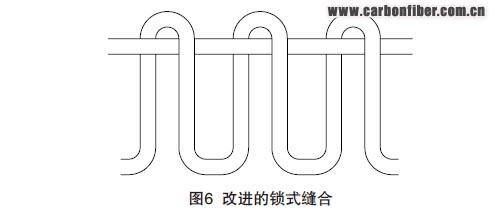 (1)鎖式縫合(改進(jìn)鎖式縫合)。因其工藝性較好在復(fù)合材料預(yù)制體研制中得到廣泛使用。傳統(tǒng)鎖式縫合方式較常見(jiàn),其特點(diǎn)是縫線(xiàn)和底線(xiàn)的結(jié)點(diǎn)在制件厚度的中間位置,這對(duì)于復(fù)合材料來(lái)說(shuō),結(jié)點(diǎn)處的應(yīng)力集中很大程度上會(huì)影響復(fù)合材料性能的提高。因此,在傳統(tǒng)鎖式縫合的基礎(chǔ)上進(jìn)行工藝優(yōu)化,出現(xiàn)了改進(jìn)鎖式縫合,圖6即為改進(jìn)的鎖式縫合。在復(fù)合材料縫合中,改進(jìn)鎖式縫合應(yīng)用較多,使用此縫合方式制件在厚度方向縫合線(xiàn)彎曲少,對(duì)面內(nèi)纖維的損傷少,由縫合引起的應(yīng)力集中也較小,因此使復(fù)合材料具有相對(duì)更高的損傷容限。 內(nèi)容來(lái)自123456