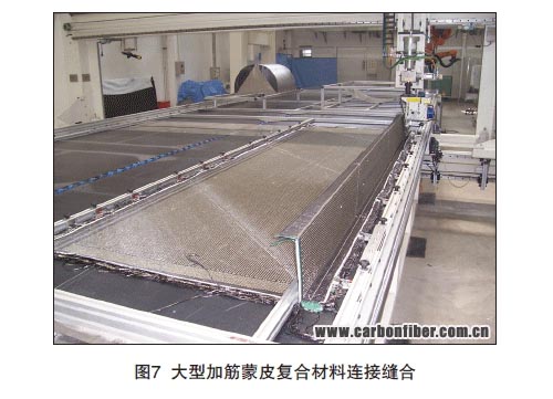 鎖式縫合因其受雙面縫合的工作原理所限,對(duì)預(yù)成型體的縫合工作只能在縫合設(shè)備工作平臺(tái)上完成,所以通常此種縫合方式只適用于曲率相對(duì)較小的預(yù)制體上,縫合厚度可達(dá)20mm。鎖式縫合對(duì)縫線(xiàn)的張力可做相應(yīng)調(diào)節(jié),因此在沒(méi)有特殊定位要求的情況采用鎖式縫合無(wú)需對(duì)預(yù)制體使用定位膠粘劑。通過(guò)調(diào)節(jié)鎖縫,復(fù)合材料加強(qiáng)筋與蒙皮連接的結(jié)構(gòu)應(yīng)用鎖式縫合較多,在靠近立筋的縫合區(qū)需要更換小壓腳來(lái)保證縫針靠近加強(qiáng)筋根部從而完成縫合。圖7為應(yīng)用鎖式縫合對(duì)復(fù)合材料大型加筋蒙皮的連接縫合。