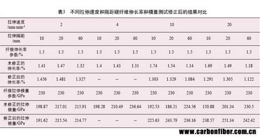 最后可以根據(jù)線性回歸后的分析結(jié)果,對(duì)測(cè)試讀出的數(shù)據(jù)進(jìn)行修正。將系統(tǒng)受力產(chǎn)生的伸長(zhǎng)量剔除,得到碳纖維真正的伸長(zhǎng)率和模量等力學(xué)指標(biāo),見表3。