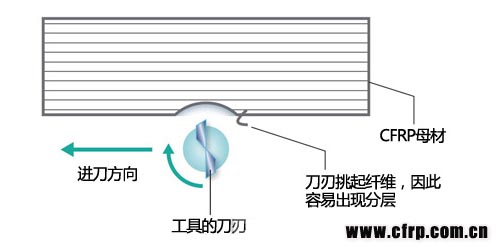 2]工具的旋轉和進刀方面,加工CFRP特別需要注意的是工具的旋轉方向和進刀方向。因為由預浸材層疊而成的CFRP具有各向異性。