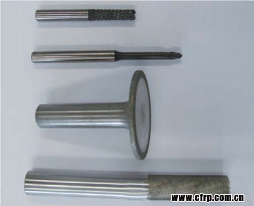 上面的兩個是通過CVD(化學氣相沉淀)涂布了金剛石的超硬合金立銑刀,屬于市售工具。下面兩個是電沉積了金剛石砂粒的工具,是在工具廠商協(xié)助下自制的工具。 本文來自123