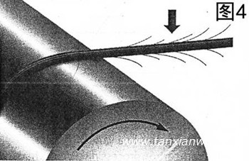德國TOPOCROM公司開發(fā)了適用于碳纖維加工過程的導(dǎo)絲輥和其元件(圖2)。一般的羅拉在導(dǎo)絲過程易產(chǎn)生斷絲(圖3)或毛絲(圖4),由此常發(fā)生中斷現(xiàn)象,而該公司設(shè)計(jì)的羅拉表面如圖5所示,絕對(duì)無銳邊并形成“軟”形態(tài)(圖6),在絲束行進(jìn)過程形成氣墊而有利于更好滑動(dòng)(圖7),總之,它適用于加工碳纖維、芳綸、玻纖、陶瓷纖維及玄武巖纖維,而且具有高耐磨和耐腐蝕性、壽命長、均勻的表面結(jié)構(gòu)而有利于纖維的緩和處理,可達(dá)到最佳拉伸狀態(tài)、滑動(dòng)性良好,并具有良好的緩沖和減震作用。