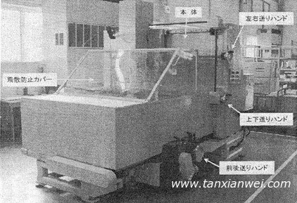 玉川工業(yè)公司開發(fā)了高精度的CFRP大型板材的切斷裝置,可加工厚度200mm、寬200mm、長1.2m的板材,該切斷機(jī)有7大特點(diǎn):①將4角支撐組合起來,并裝備采用密閉式的無油心軸,使偏差和耐久性獲得飛躍式提高,并實(shí)現(xiàn)免維修;②隨著主軸剛性的提高,可搭載1.5kW的馬達(dá)。③由于砂輪頭和工作臺(tái)可以旋轉(zhuǎn),可一次裝卡而同時(shí)進(jìn)行垂直和平行加工;④通過控制變換器調(diào)整切速改進(jìn)容量,可自由選擇切速;⑤提高工作臺(tái)前后動(dòng)作部件的剛性,而且前后的輸送罩采用可動(dòng)式,以防止雜物進(jìn)入;⑥全軸可決定高精度的位置;⑦為保持柱子的剛性,采用兩端支柱和橫軸滑動(dòng)梁的門型結(jié)構(gòu)。機(jī)械尺寸寬2.3m、長3.2m、高2.15m,重2.5t,外形如圖8所示。