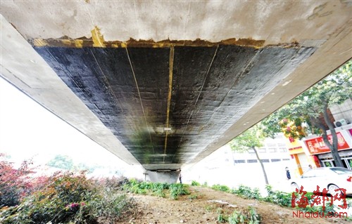 記者在五里亭高架橋下方,見到橋底被罩上一層塑料布,布片條紋清晰、斷裂處摸上去很硬,很像平時常見的蛇皮袋。布的表面涂抹著一層淡黃色的液體,液體凝固后,硬度很高,用鑰匙無法劃出痕跡。 copyright 123456