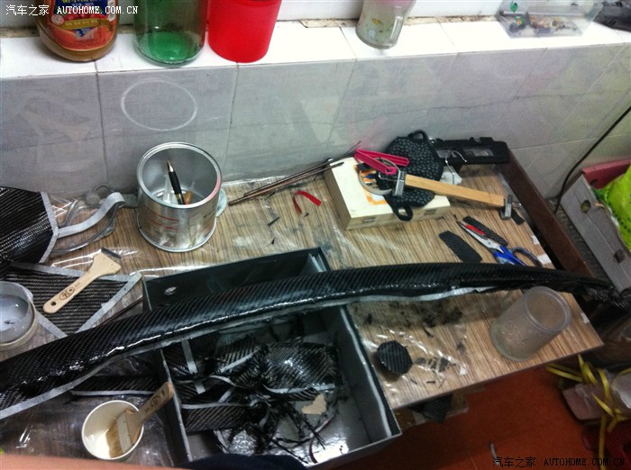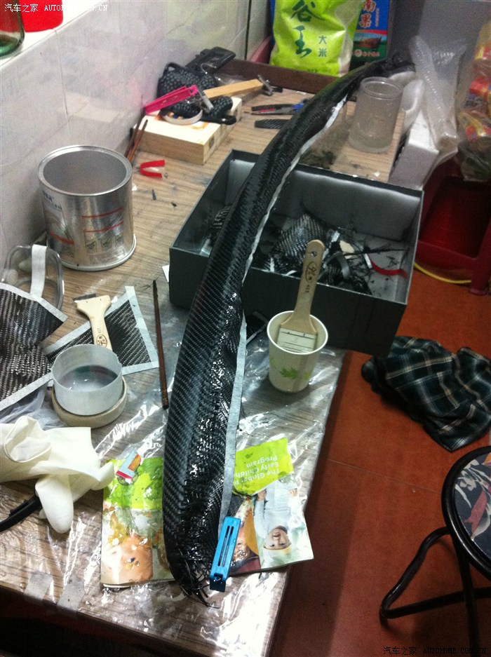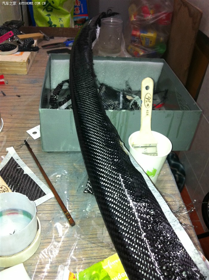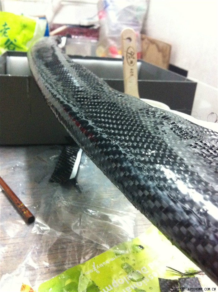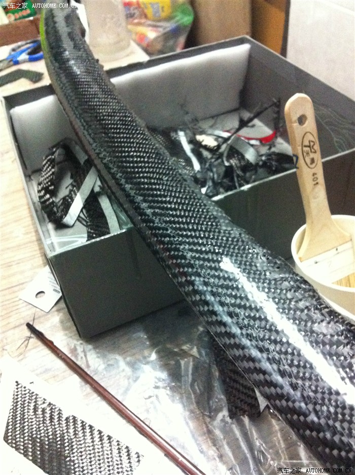 “車禍現(xiàn)場(chǎng)”兄弟,請(qǐng)看下面的幾個(gè)照片,尾翼制作過(guò)程中,包的雙層碳纖維,樹(shù)脂要刷好幾遍呢,這是第二層的第二遍,預(yù)計(jì)還要一周時(shí)間。