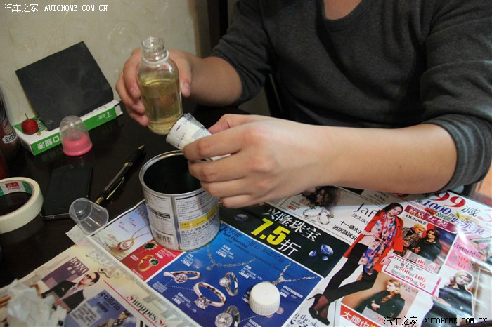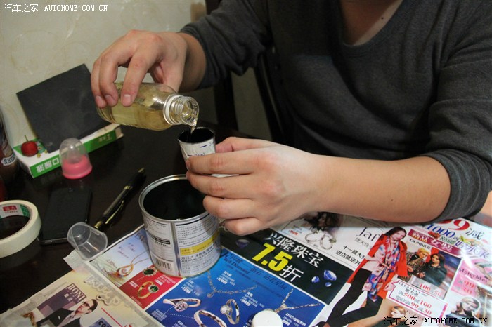 開(kāi)始調(diào)配環(huán)氧樹(shù)脂膠,樹(shù)脂和固化劑的比例也要弄清楚,攪拌好之后,拿一個(gè)新刷子就可以刷膠了,刷環(huán)氧樹(shù)脂可以不用等,直接刷就是了,注意下面要用東西鋪好,膠會(huì)滴下來(lái)的。
